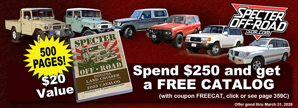 From February 13, 2026 through March 31, 2026, when you spend $250 you get a free 2025 SOR Catalog. If your purchase qualifies, add the FREECAT from the box below. Qualifying purchases are Land Cruiser parts not including core charges, handling charges, shipping and tax. This coupon is not automatically added to your order. If you want it, you have to add it to your cart. One coupon per order. Orders will not be combined for shipping. Due to the quantity of orders we receive and speed at which the orders are processed, coupons can not be added after the order has been submitted.